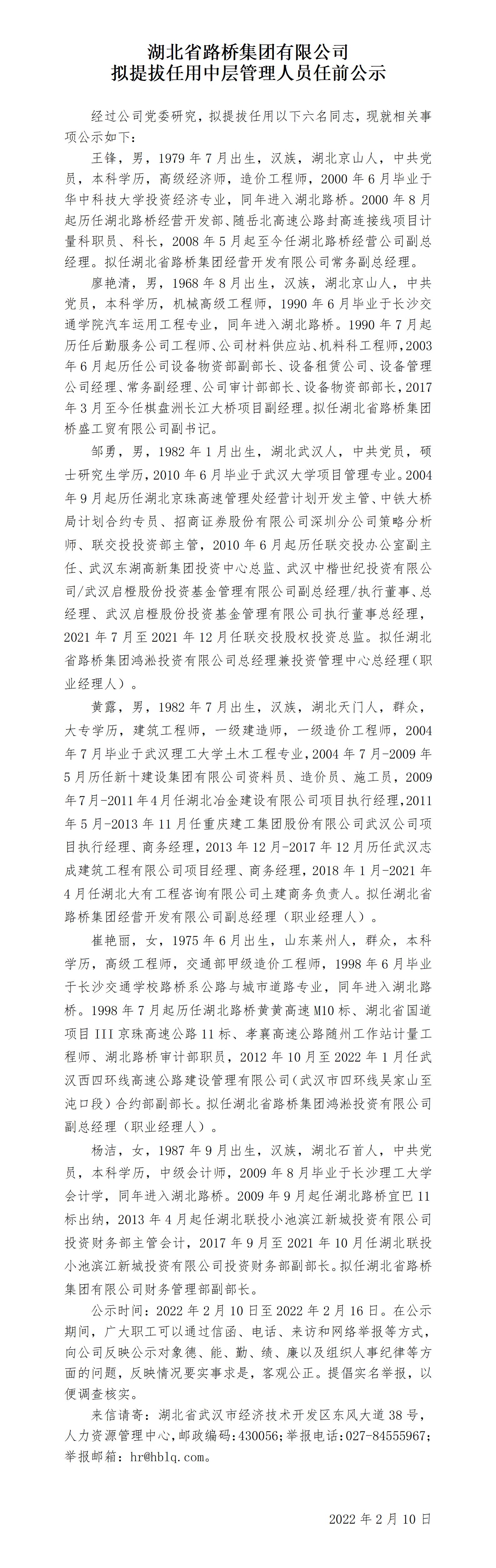 湖北省路橋集團有限公司擬提拔任用中層管理人員任前公示