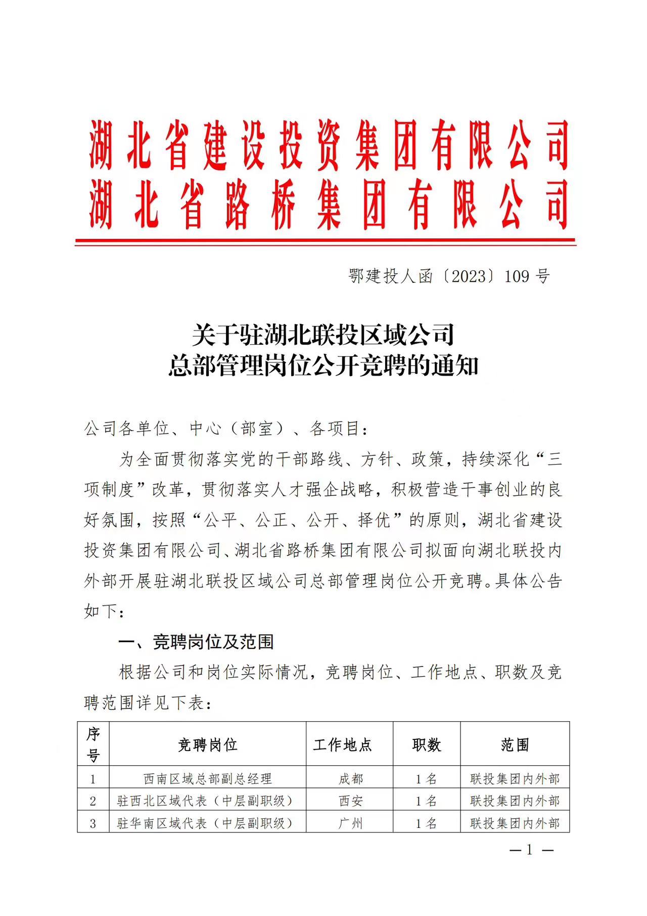 關(guān)于駐湖北聯(lián)投區(qū)域公司總部管理崗位公開(kāi)競(jìng)聘的通知
