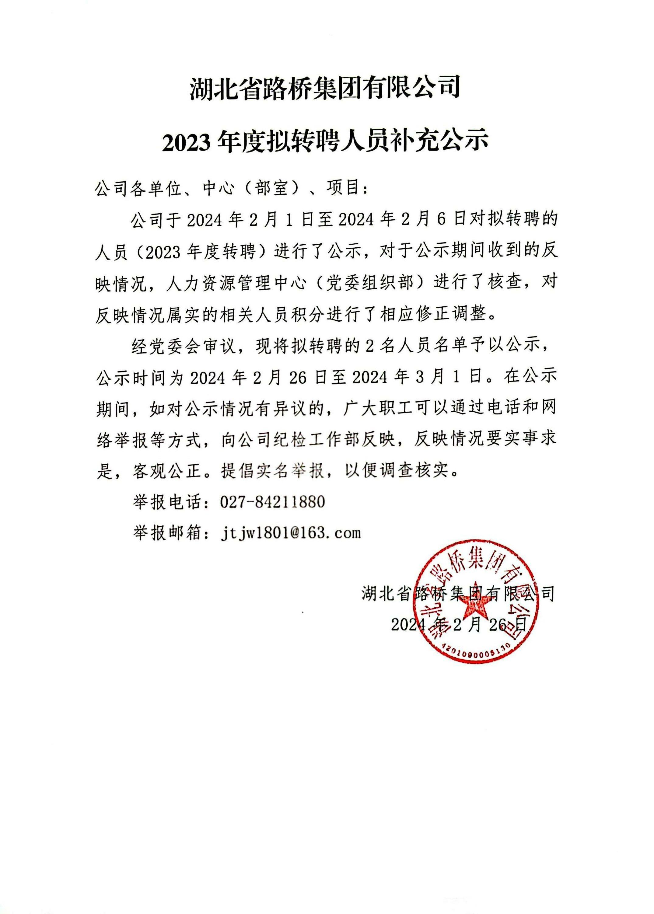 湖北省路橋集團有限公司2023年度擬轉(zhuǎn)聘人員補充公示