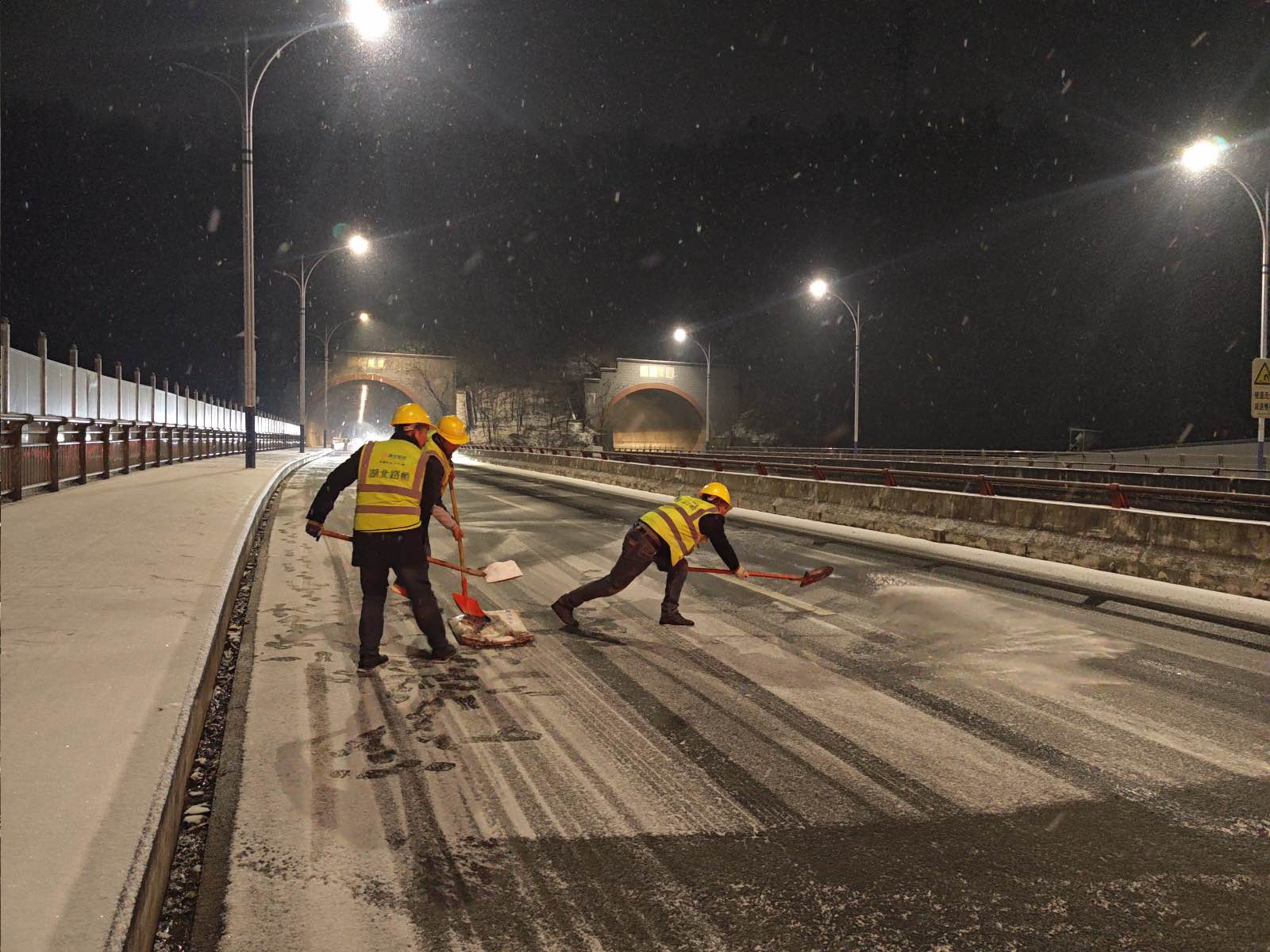 風(fēng)雪驟至,戰(zhàn)鼓催征。19日晚,降雪如期而至且強(qiáng)度持續(xù)升級,路面被積雪覆蓋,冰層快速凝結(jié)。項目應(yīng)急攻堅隊即刻集結(jié),60余名養(yǎng)護(hù)人員身著“高速橙”,駕駛16臺鏟雪設(shè)備、10臺撒布機(jī)火速奔赴各責(zé)任路段。現(xiàn)場采取“機(jī)械為主、人工為輔”的科學(xué)作業(yè)模式,構(gòu)建“前鏟后撒、循環(huán)推進(jìn)、全域覆蓋”的梯隊作戰(zhàn)體系;鏟雪車轟鳴開路,鐵鏟破冰掃雪,在風(fēng)雪中開辟出暢通通道;撒布車緊隨其后,精準(zhǔn)播撒融雪劑,加速冰層消融,不留一處死角、不存一處隱患。項目實行領(lǐng)導(dǎo)帶班制和24小時值守制,黨員干部沖鋒在前、靠前指揮,實時研判路況、科學(xué)調(diào)度力量,用身影詮釋擔(dān)當(dāng),用行動凝聚斗志。寒夜中,凜冽的寒風(fēng)裹挾著雪粒,拍打在養(yǎng)護(hù)人員的臉上,他們卻無暇顧及濕透的衣物、凍僵的雙手,始終堅守作業(yè)一線。截至目前,項目累計完成除雪里程64.4公里,消耗融雪劑100余噸,有效保障高速路通行安全。
