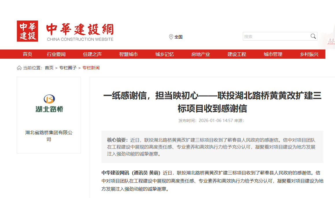 近日,聯(lián)投湖北路橋黃黃改擴(kuò)建三標(biāo)項(xiàng)目收到了蘄春縣人民政府的感謝信,中華建設(shè)網(wǎng)對此進(jìn)行報(bào)道,以下是報(bào)道全文: