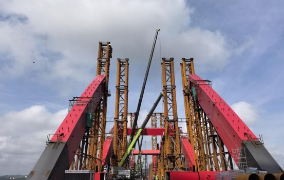 圖:大橋鋼拱肋吊裝施工現(xiàn)場
